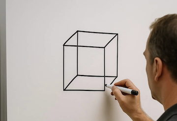 “Look at this wire frame box and tell me which is the front square of the box and which is the back?“ Joe says.
